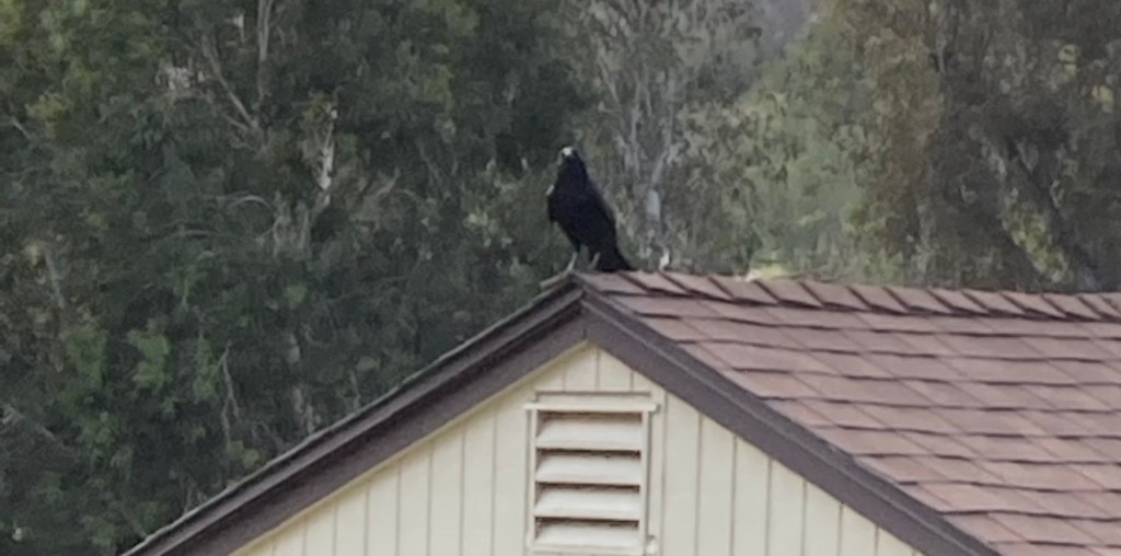 The next day I came to the coop, armed with my post-it and pencil, ready to get the numbers right!  Just as I arrived, I noticed a crow (pictured above) also arrived and perched on a shed nearby.  We’ve got lots of crows around this place, so I didn’t think much of it at first.  But this crow was different.  He was watching my every move, studying me, calculating, it was creepy.